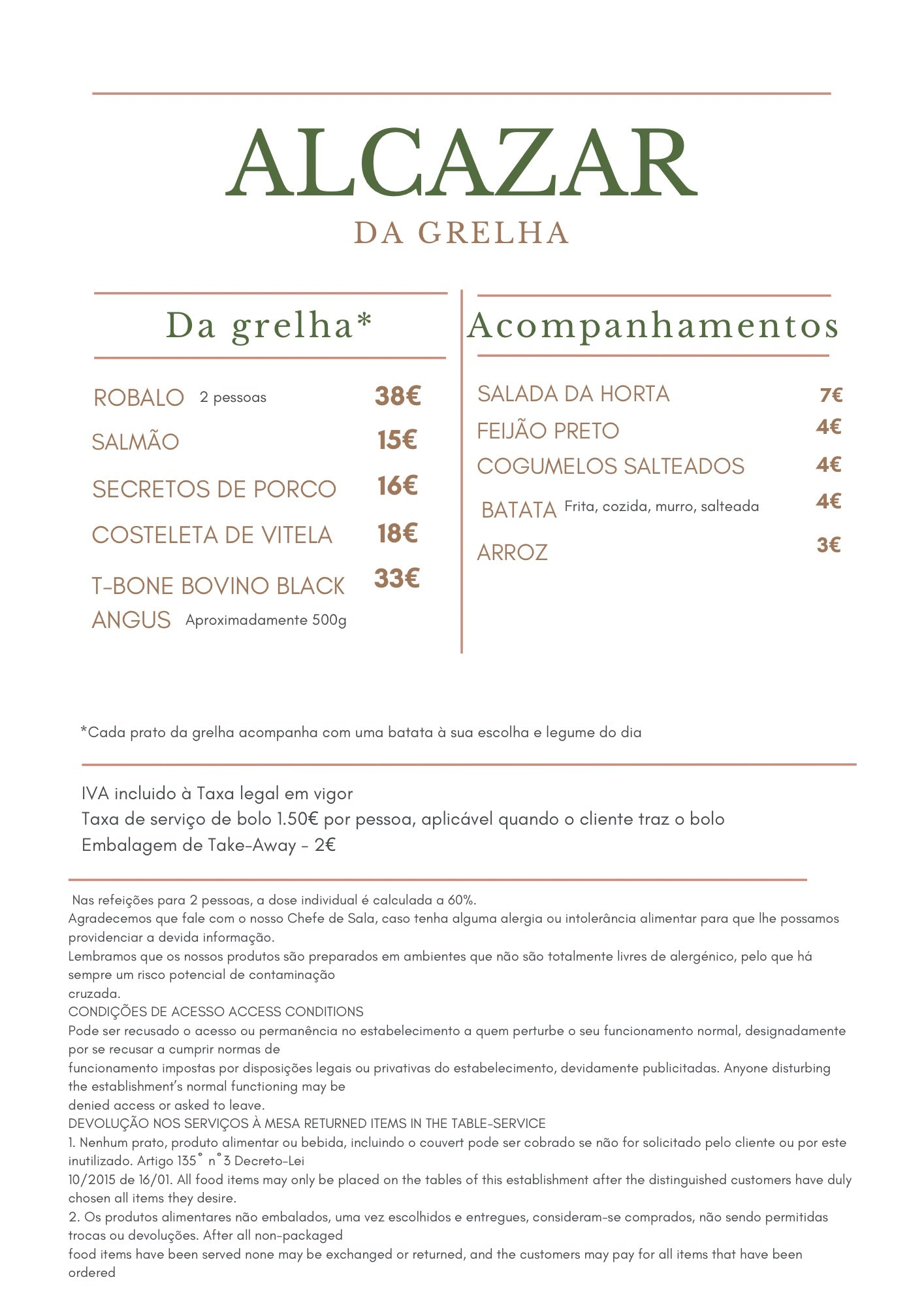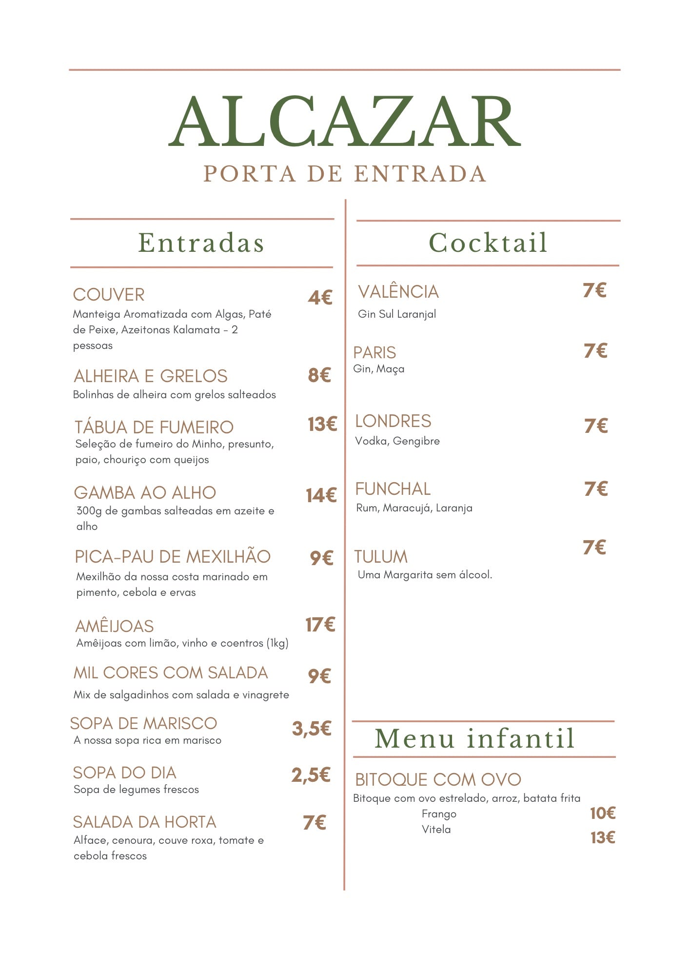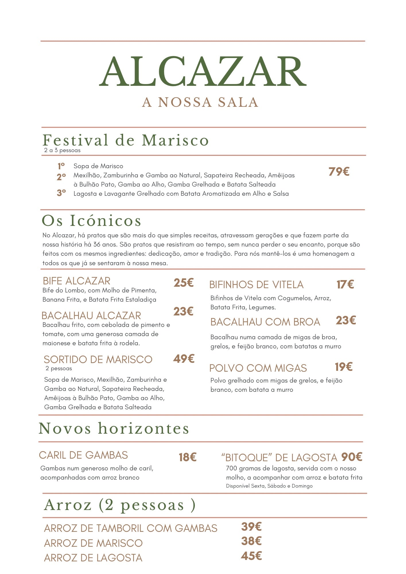 Para os amantes de carne, temos opções irresistíveis como o nosso Bife à Alcazar e os suculentos Medalhões com Molho de Natas. Para os mais pequenos, um menu infantil pensado para agradar a todos. Acompanhe com um vinho tinto selecionado e desfrute de uma refeição inesquecível.